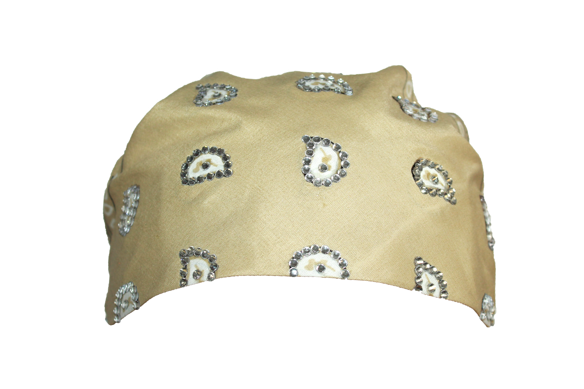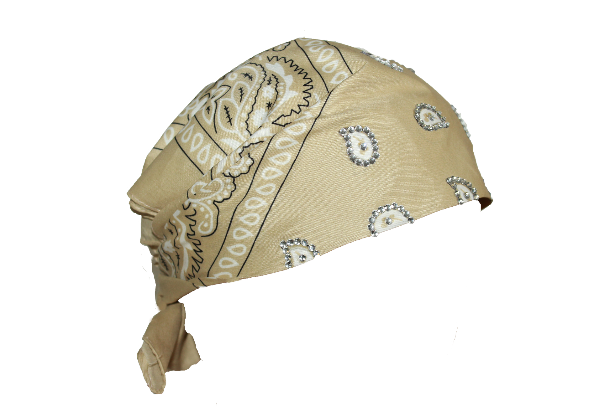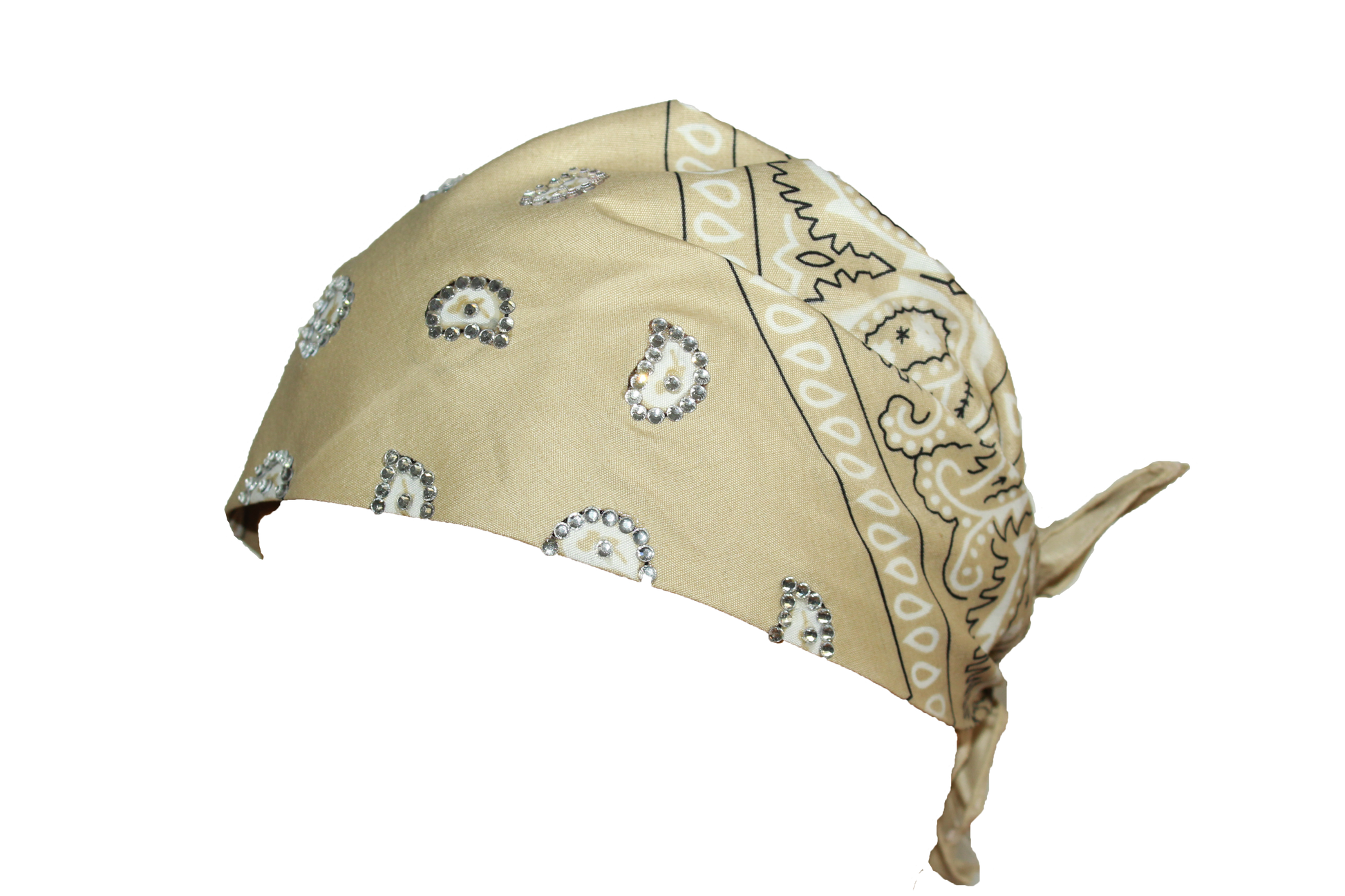 Beige 22x22in polyester bandana with securely applied rhinestones for long lasting wear.