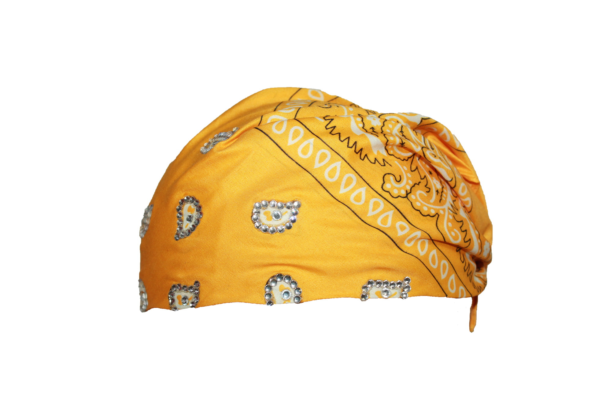 Mustard yellow 22x22in polyester bandana with securely applied rhinestones for long lasting wear.