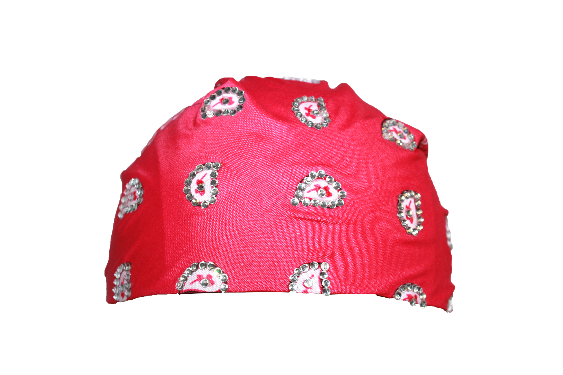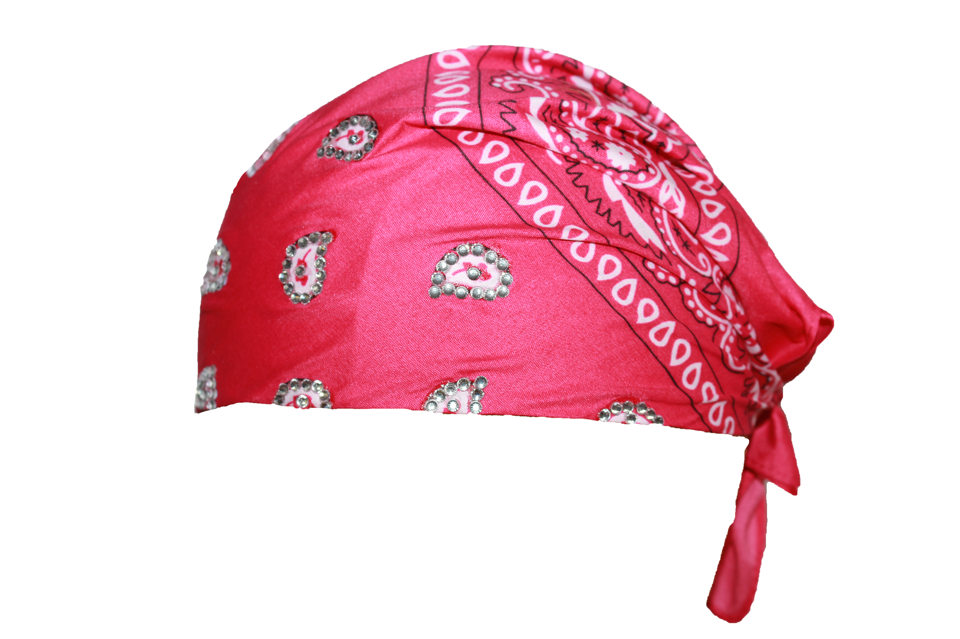 Hot pink 22x22in polyester bandana with securely applied rhinestones for long lasting wear.