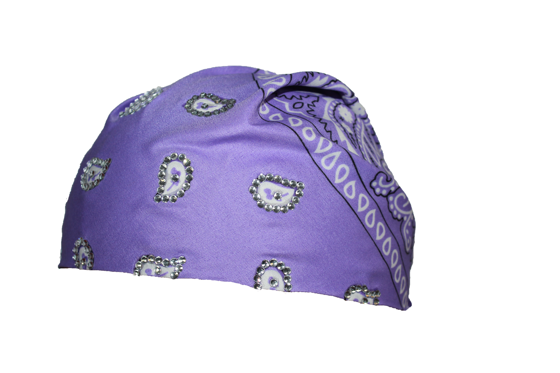 Lavender 22x22in polyester bandana with securely applied rhinestones for long lasting wear.