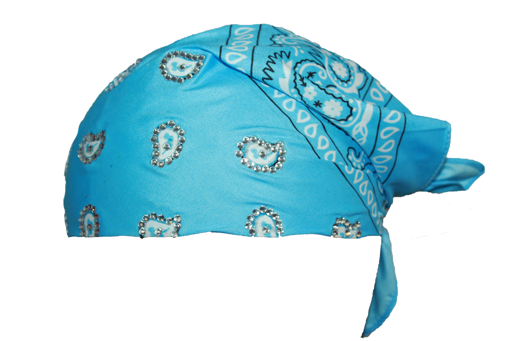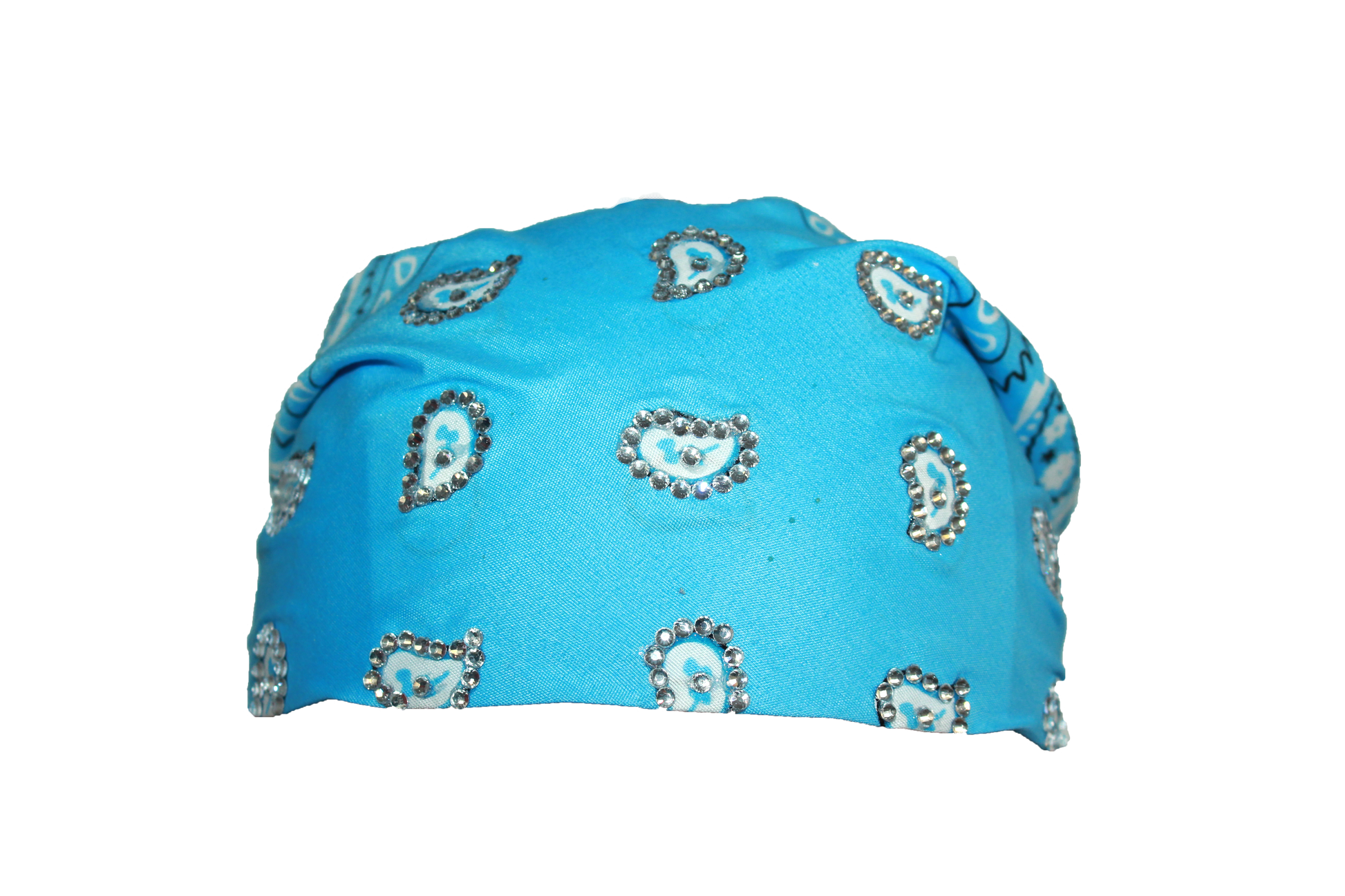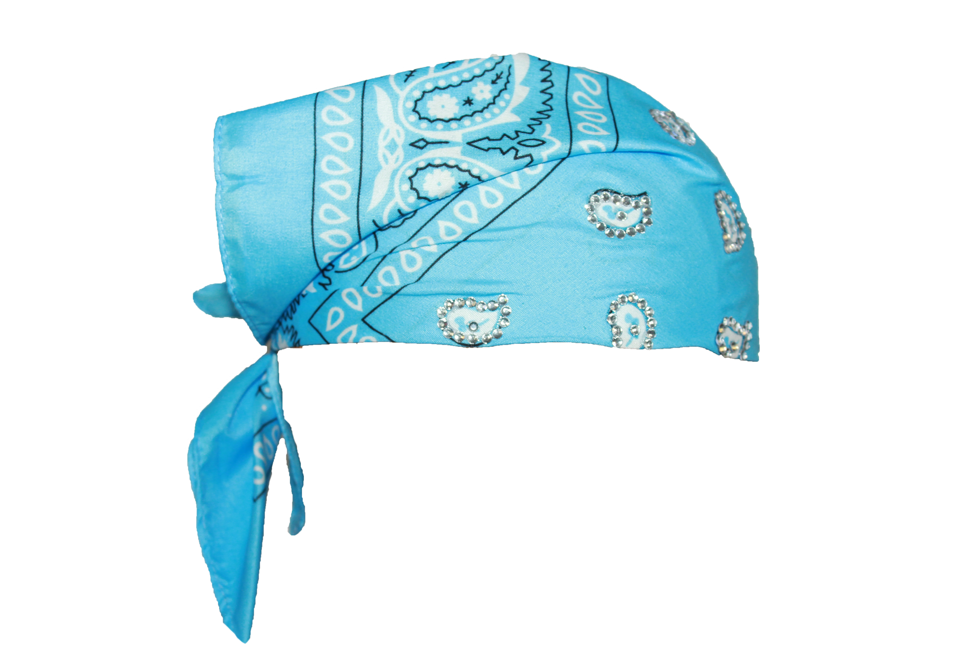 Sky blue 22x22in polyester bandana with securely applied rhinestones for long lasting wear.