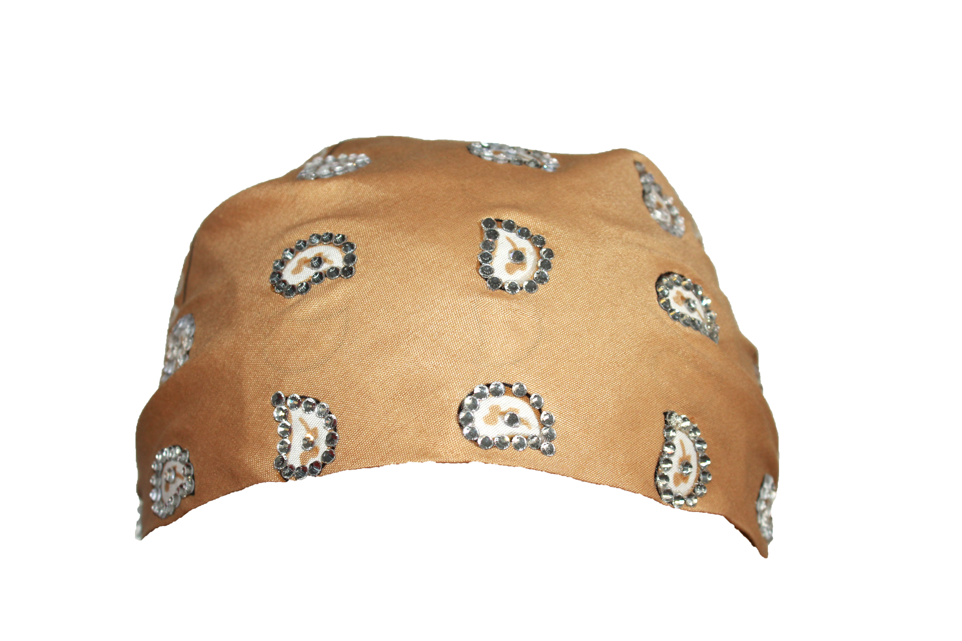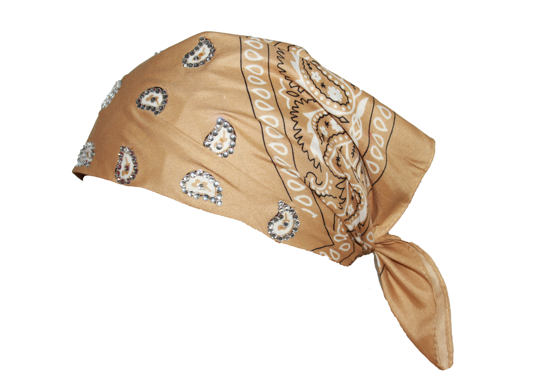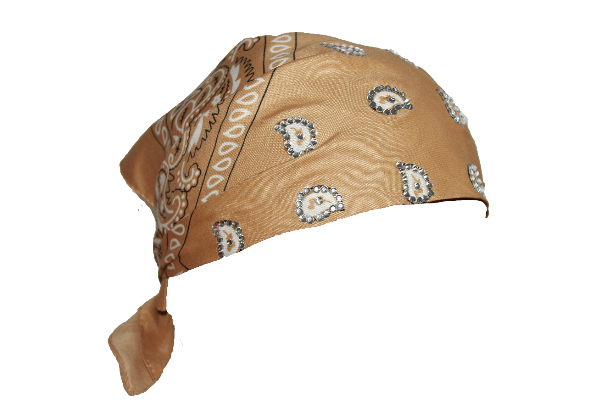 Tan 22x22in polyester bandana with securely applied rhinestones for long lasting wear.